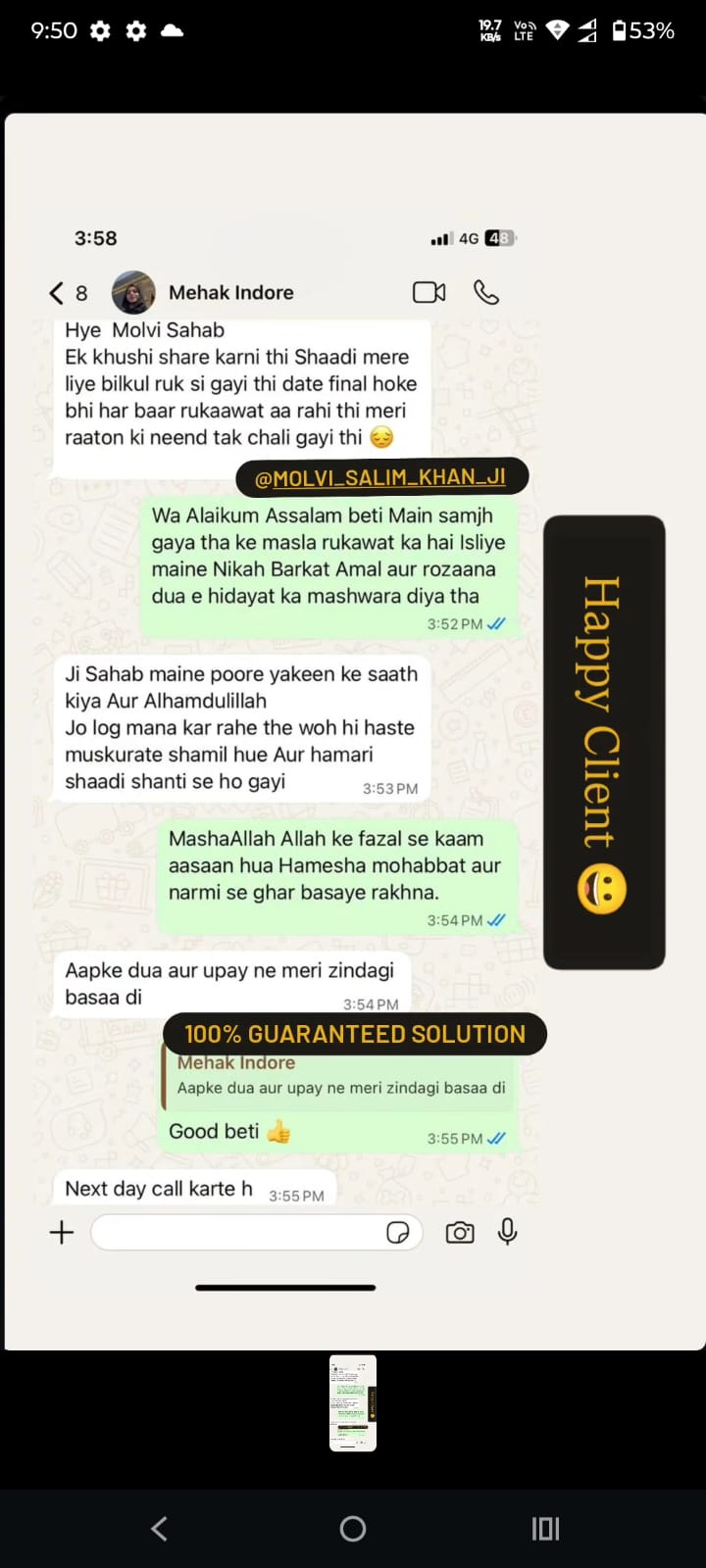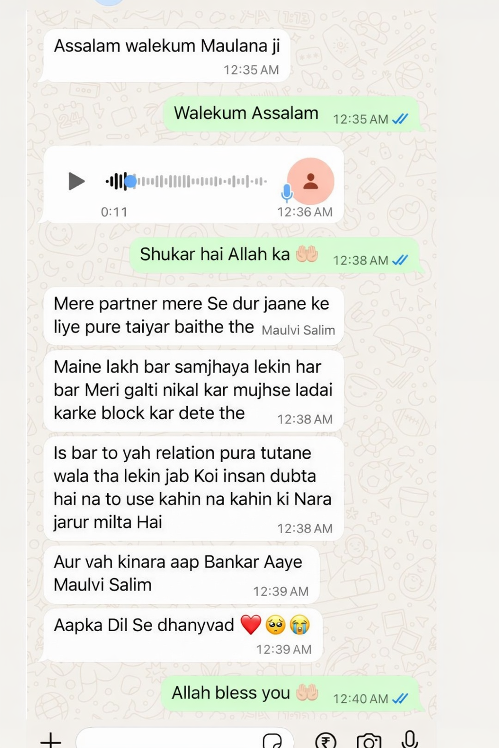 I got my girlfriend back because to Molvi Salim Khan 's dua. My reunion with her was made possible by his assistance, which makes me delighted.